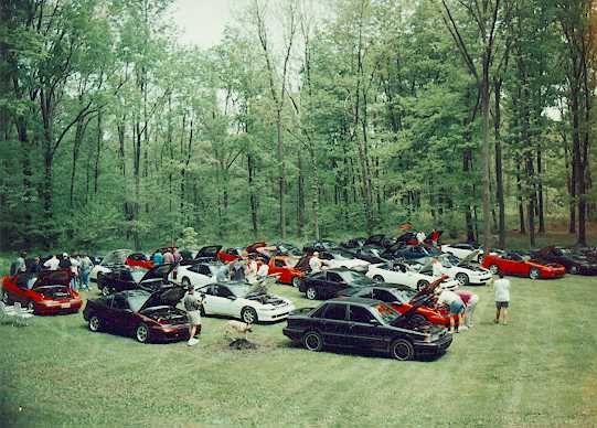 That morning everyone met at Starks Restaurant for some fine eatin'. In addition to the food was some more good advice being given out at the question-answer session. Dave dodged most questions about mods for the '95s fairly well, but other than that, things were answered very nicely. Once breakfast was over, everyone rallied out to Dave's house for the coolest car show to date... Here's a picture of just about ALL the cars that were there. Again, many thanks go to Dave for the GREAT barbeque and great time had by all.
