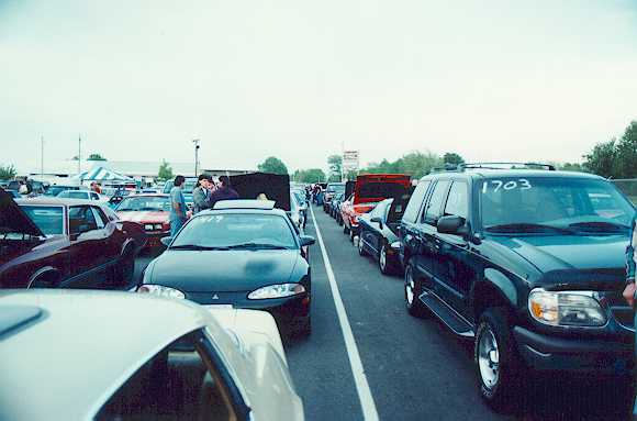 Anyway, on to the pics. First are a couple pictures of the parking lot after most everyone arrived. This is broken up into two parts... the left side and the right side. These pictures aren't very clear, but it's hard to fit so many fine automobiles into just two pictures ;-). Here's a closer look at some of them.
